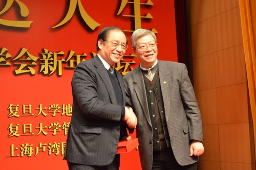 复旦大学校长杨玉良教授与刘明康先生亲切握手并赠送复旦礼品